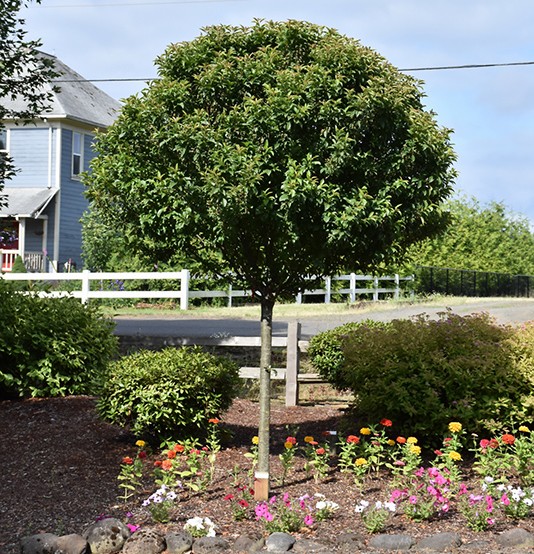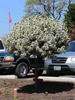 Pink buds opening to white flowers cover the dense rounded head of this top grafted, compact selection; showy and persistent golden fruit in fall that slowly turns orange; makes a spectacular front yard accent; needs full sun and good drainage.