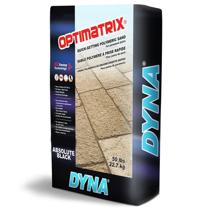 OPTIMATRIX Polymeric Jointing Sand is a dry mixture of calibrated sands, polymers, binders, and dedicated chemical controlling agents specifically designed to bind firmly and easily together in horizontal pavement joints. Applied dry into the pavement joints, it will harden and stay in place after activation. It sets in minutes after being activated with water, which ensures proper installation even when the weather calls for early rain. Carefully blended with dedicated control agents, the quality of DYNA® OPTIMATRIX Polymeric Jointing Sand ensures increased stability, performance, and lasting durability to your paver projects.