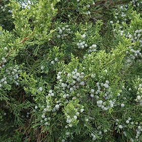 A narrow columnar evergreen shrub, makes a great accent or articulation plant in home landscapes; interesting bright green needle-like foliage and showy powdery blue berries; a very versatile landscape plant, needs full sun.