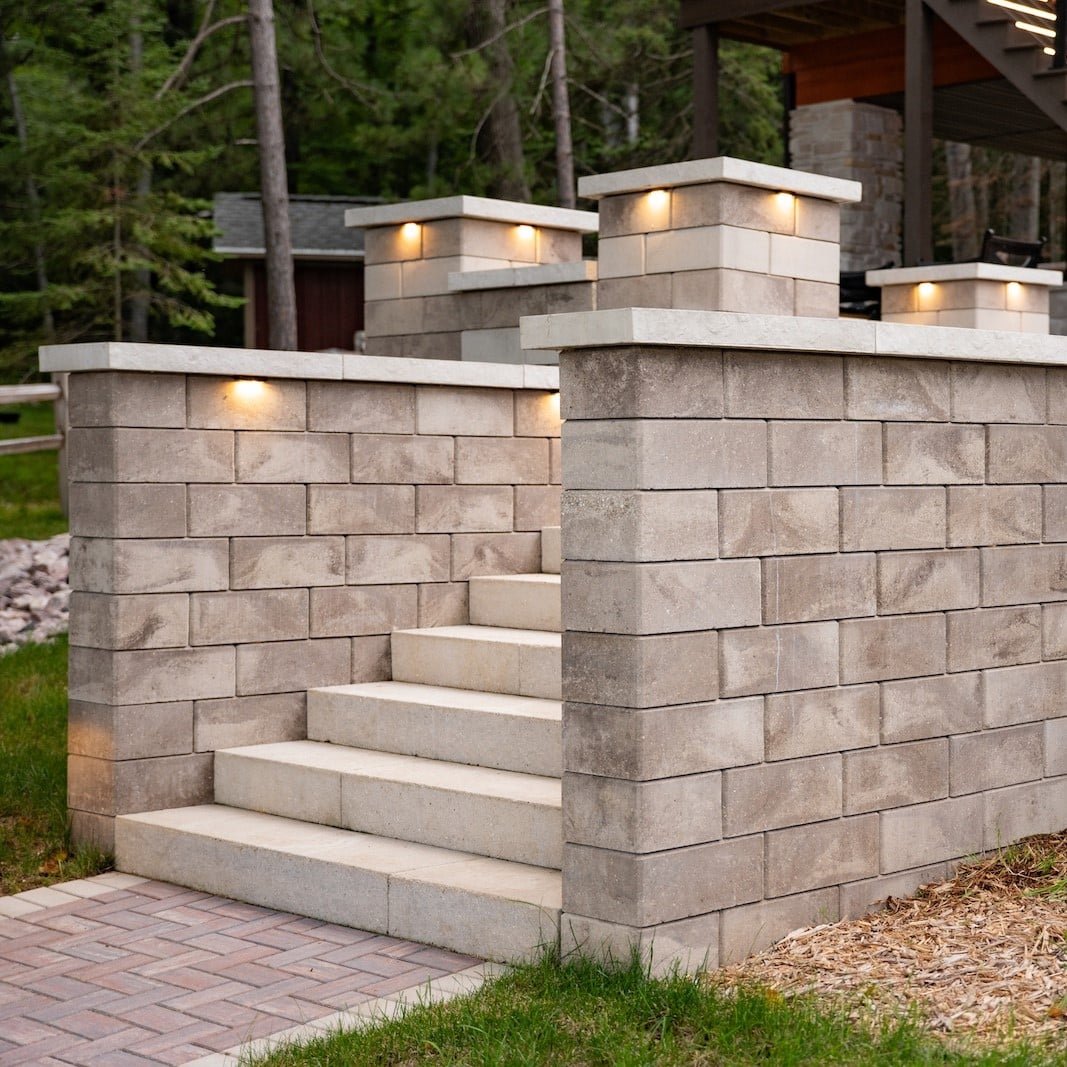 Tribute Smooth Retaining Wall Systems offer a clean aesthetic. Featuring multiple pin grooves on the top surface, these units allow a combination of retaining and freestanding wall options. Tribute Smooth units can be efficiently split in half in the field to construct pillars and wall accents.