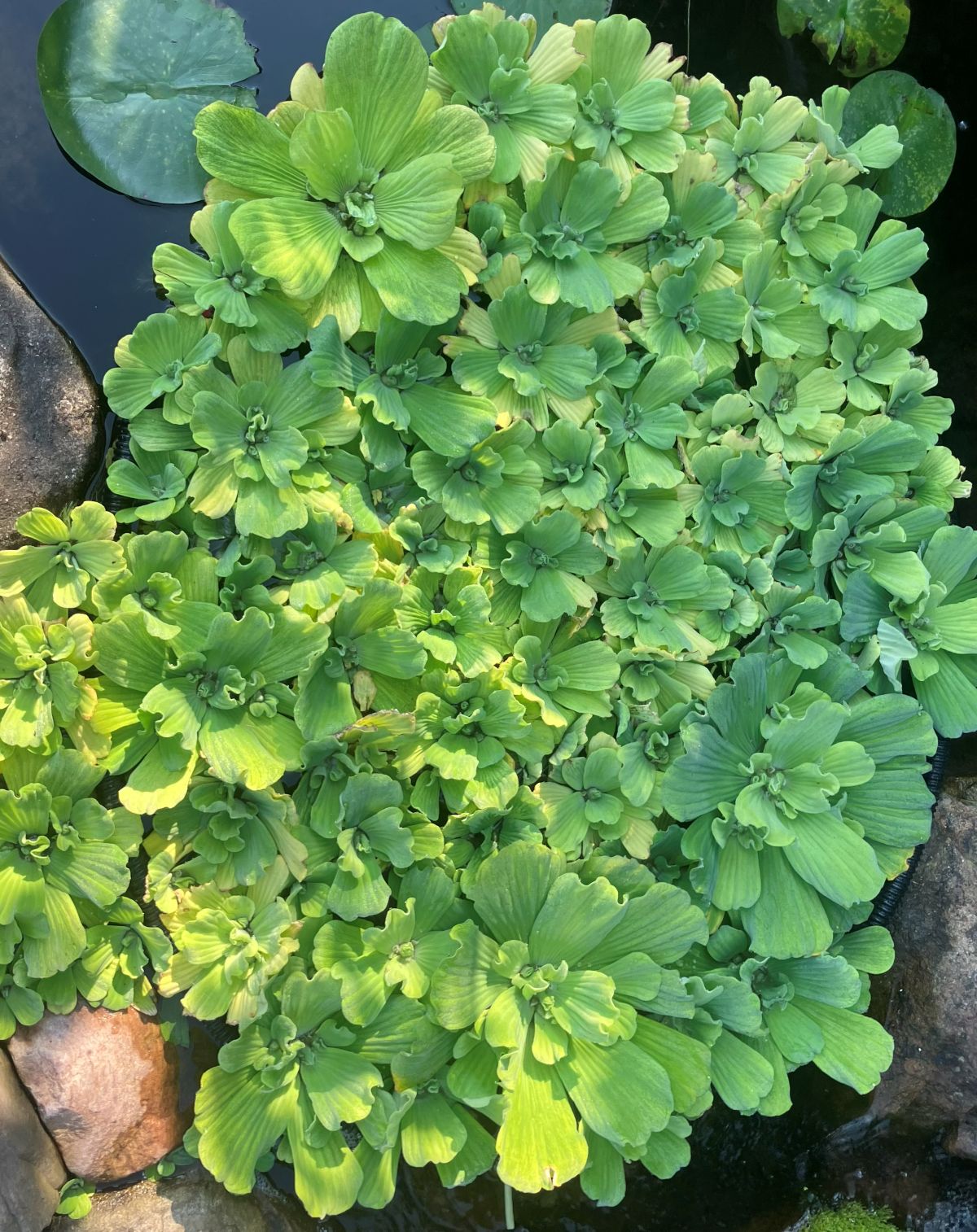 Water Hyacinth (Eichhornia crassipes) and Water Lettuce (Pistia stratiotes) are fast-growing floating plants that prefer full to partial sun and are treated as annuals. They grow exponentially, primarily through offshoots, with only a handful needed to take over a pond. These plants are widely used for rapid nutrient absorption, improving water quality, providing shade, and reducing the severity of nuisance algae. Both have roots that dangle freely in the water. Water hyacinths are known for their bulbous, spongy stalks and have the potential to produce short-lived purple flowers. Water lettuce has hydrophobic leaves that resemble a top view of lettuce.