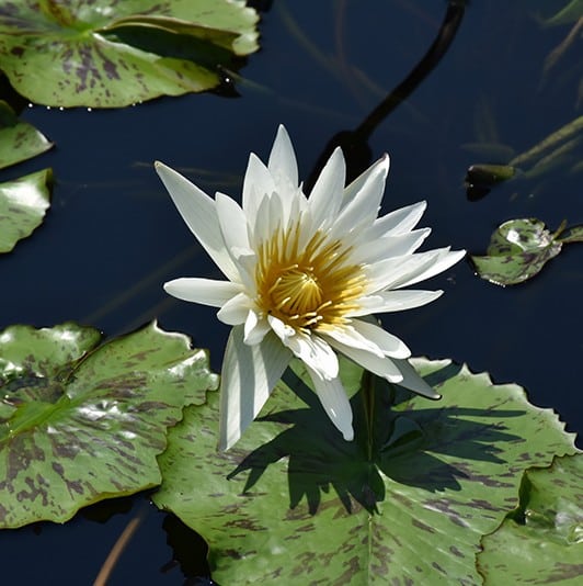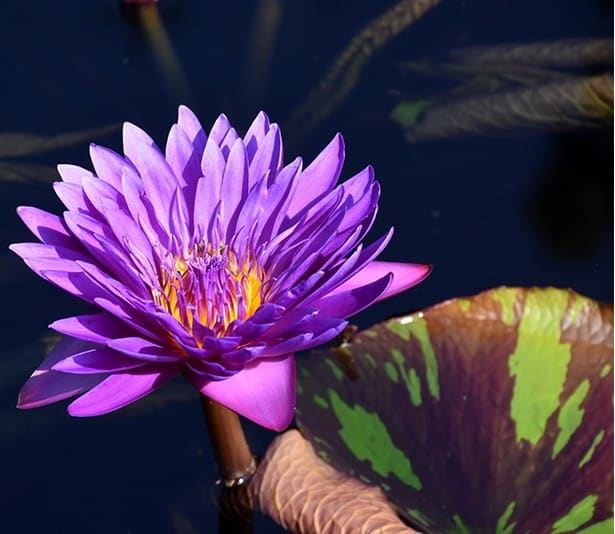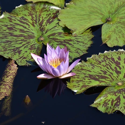 Tropical waterlilies (Nymphaea spp.) are known for their unique colorful lilypads and bold blooms to its hardy counterpart. The pots the waterlilies are sold are not intended for long-term growth. Repotting early in the growing season will prevent stunting and increase the likelihood of blooming. A great option for shading a pond, intended to be grown as an annual.